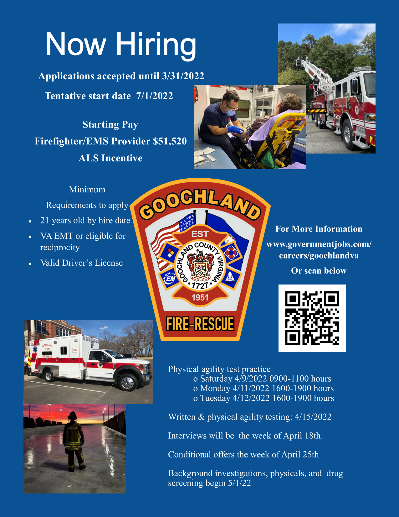 Goochland County is Hiring Firefighter EMTs, Intermediates, & Paramedics Posted March 7th, 2022 & filed under News.